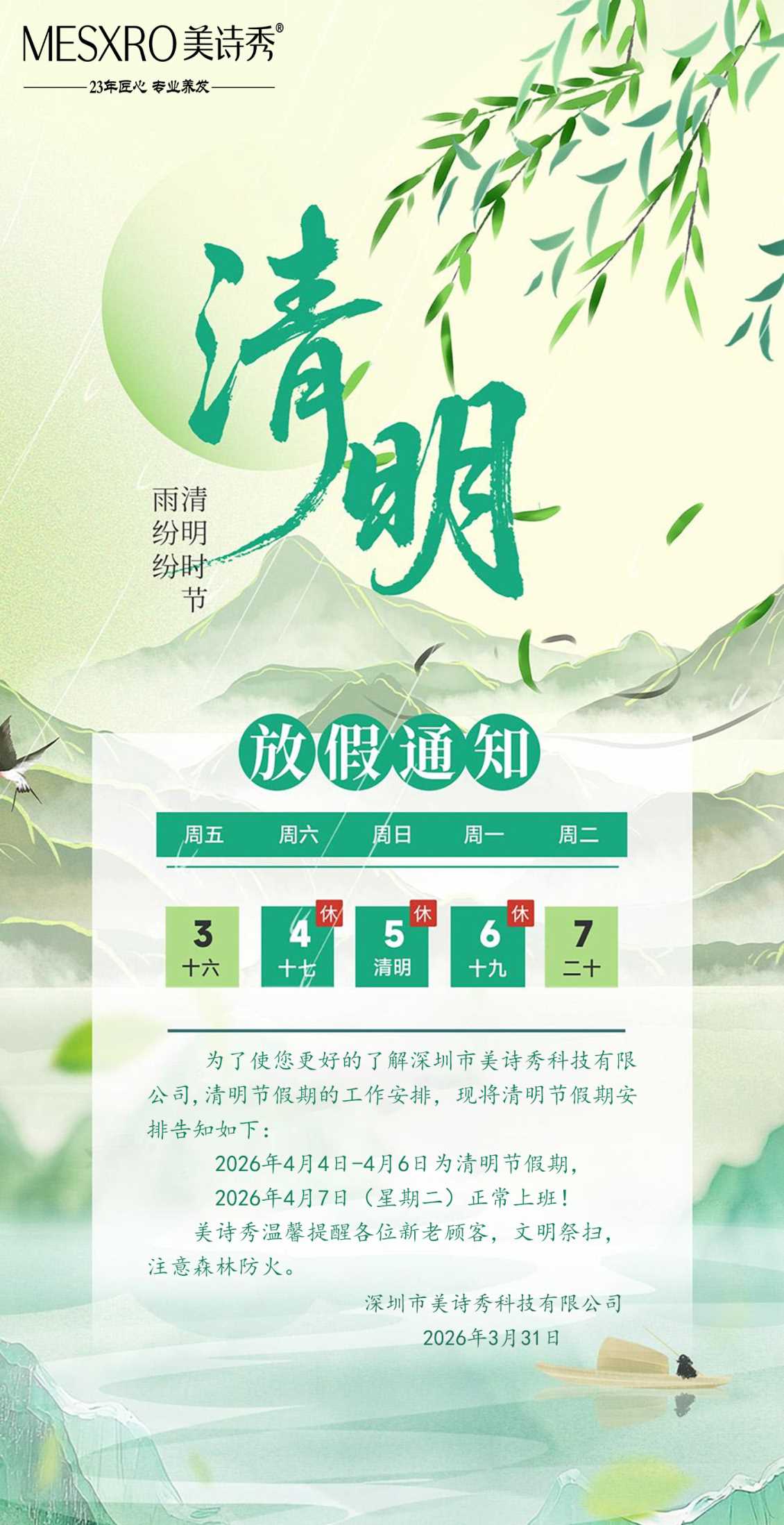 为了使您更好的了解深圳市美诗秀科技有限公司,清明节假期的工作安排,现将清明节假期安排告知如下: